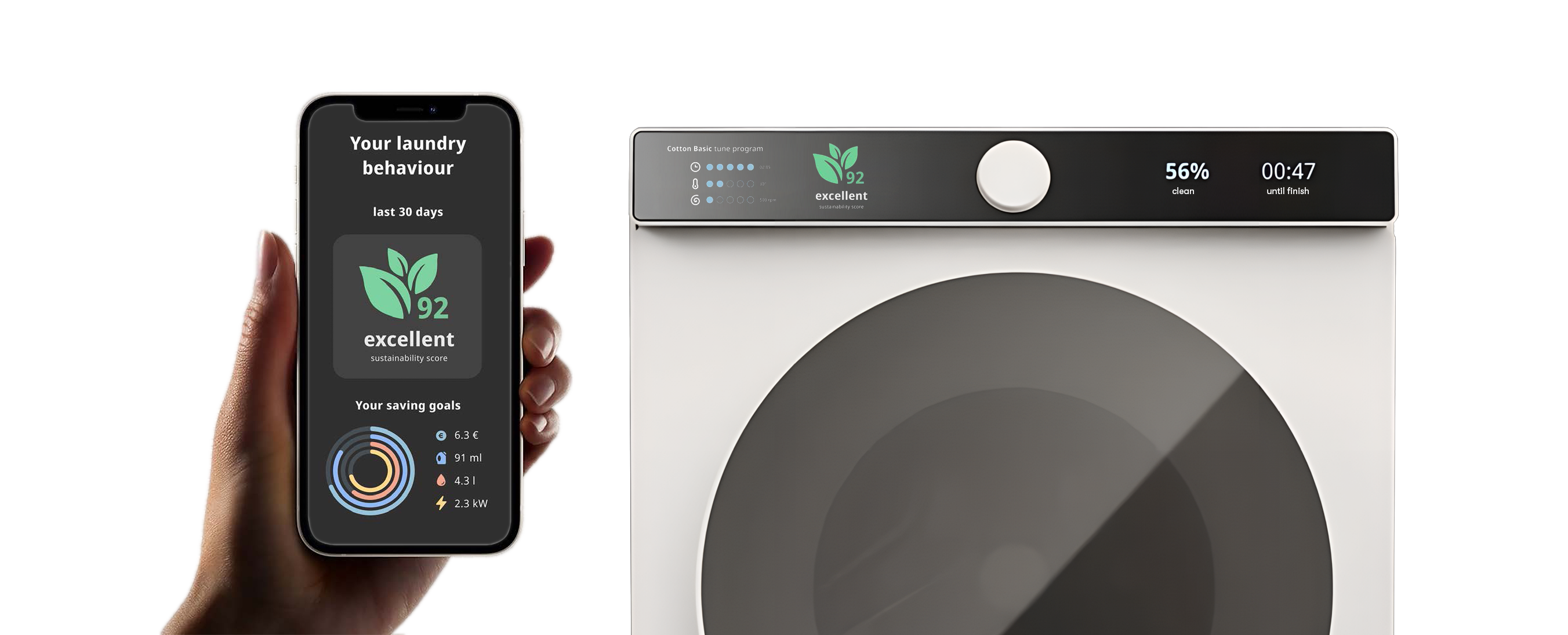 The interaction layer was a core part of my contribution — storyboarding the full user journey and creating mock UI screens for the companion app and machine HMI. Key moments included real-time sustainability scoring, guided DIY repair flows with AR support, and consumption monitoring that makes abstract data tangible.