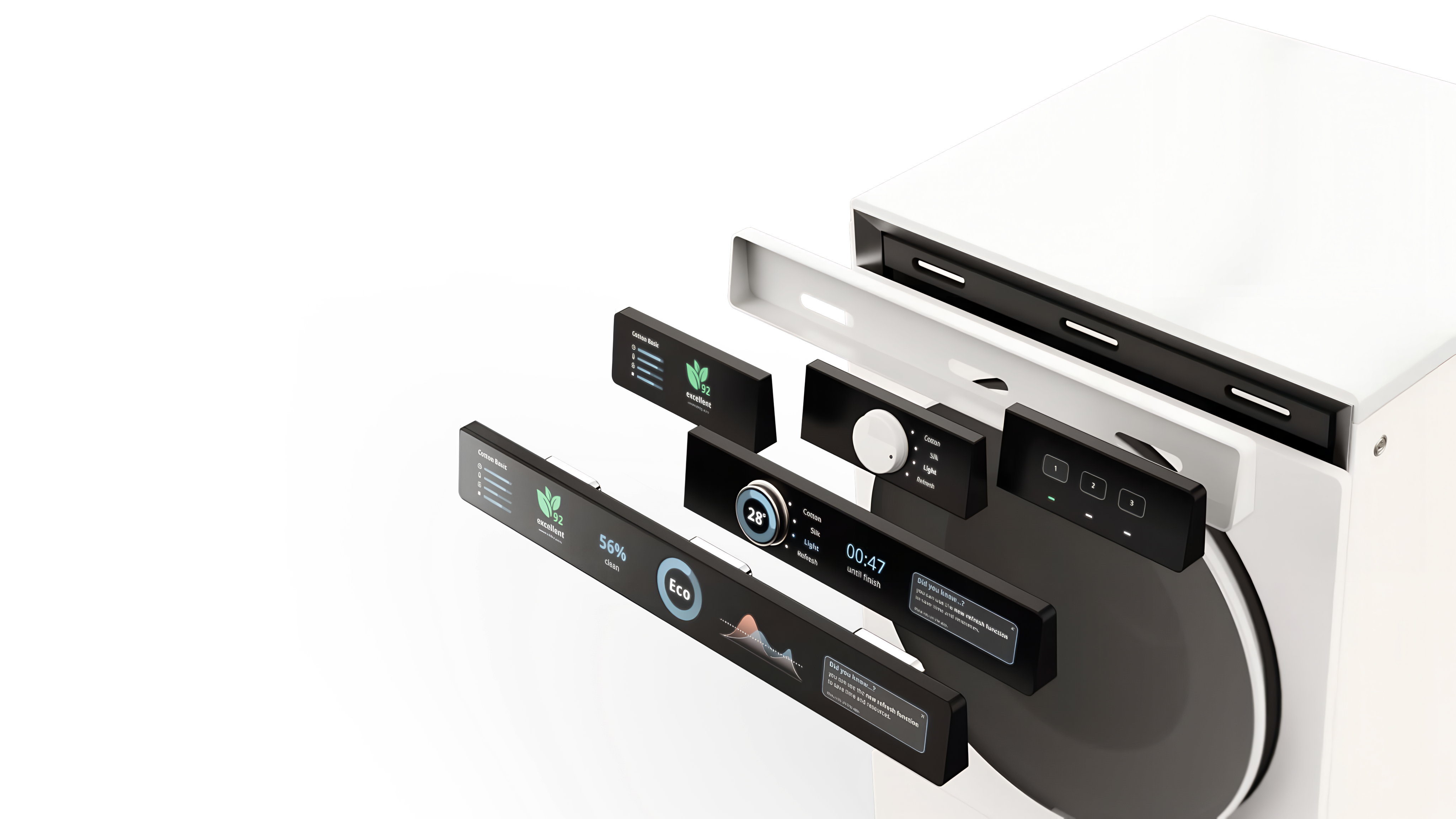The machine HMI was designed as an upgradable module — ranging from a minimal selector wheel to a full-width display. Adapting interaction complexity to user needs over the machine's lifetime, without requiring a new appliance.