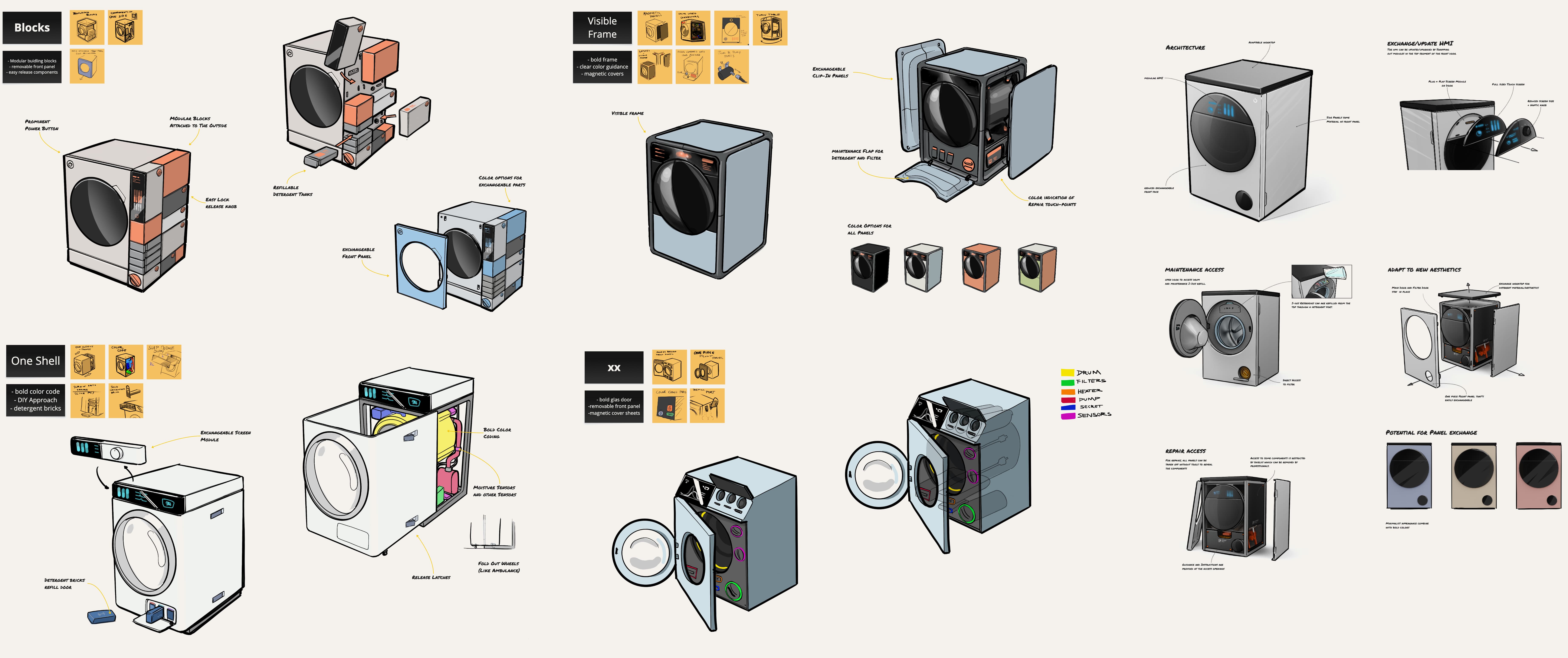 As a team we developed ideas for the machine exterior — exploring modularity, repairability access hierarchies, and panel systems that allow the machine to be aesthetically updated without replacement. The structural frame concept became the backbone of the entire vision: a platform designed to be repaired, upgraded and adapted over 15+ years.