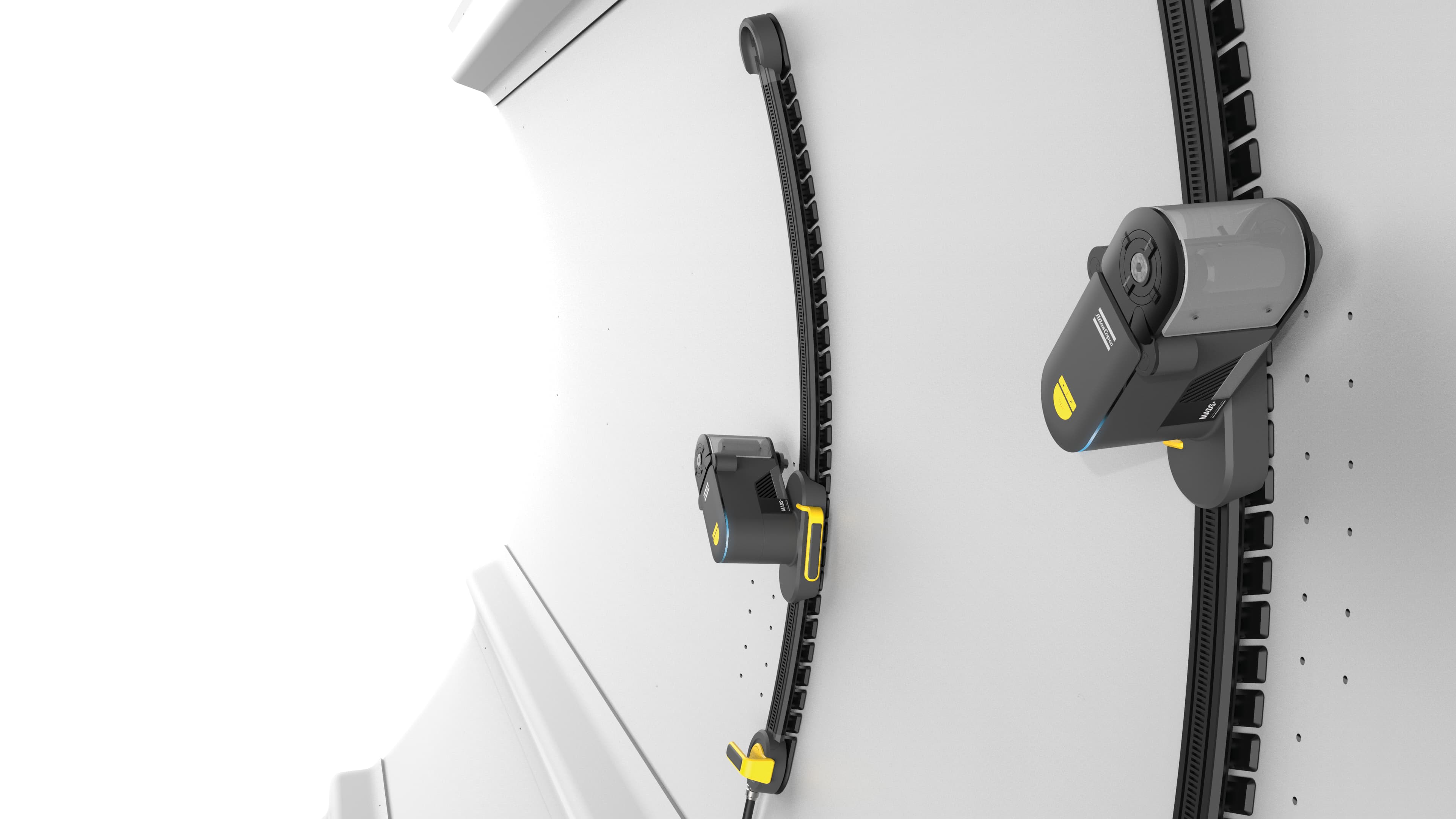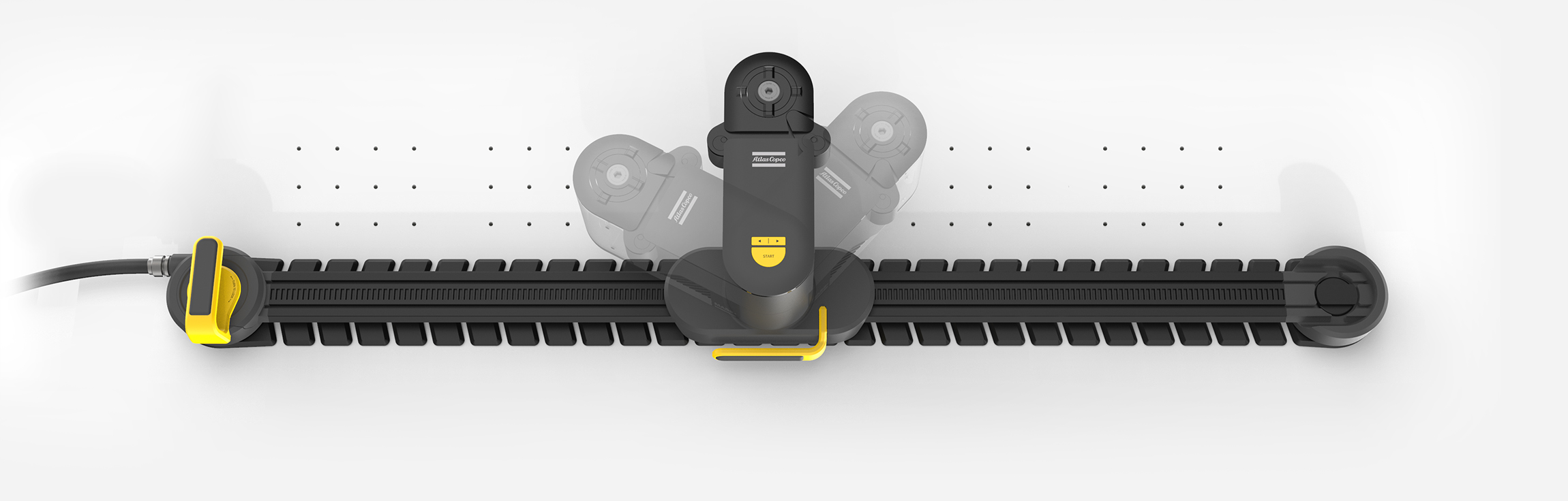 The final MADS uses a continuous flexible track rather than the segmented one from the mock-up phase — better conformability to fuselage curvature, cleaner silhouette. The CMF was refined significantly to meet Atlas Copco's premium industrial standard: a dark structural body, yellow accent details on all operator-touch points, and a matte finish that reads as precision equipment rather than prototype.