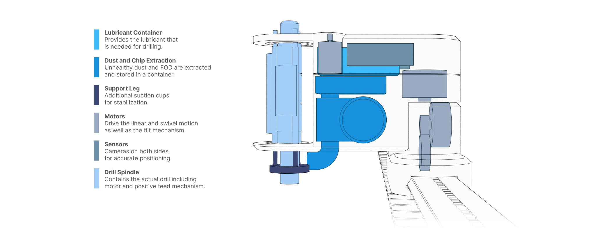 MADS moves in one linear axis along the rail, while a swivelling arm extends its reach to cover all holes within a defined lateral distance — a 1½D kinematic that keeps the system simple and reliable. The drill spindle includes a tilt mechanism using two eccentric pivots (borrowed directly from the Shaper tool concept) that keeps the bit perpendicular to the curved fuselage surface at every position, regardless of the local contour.